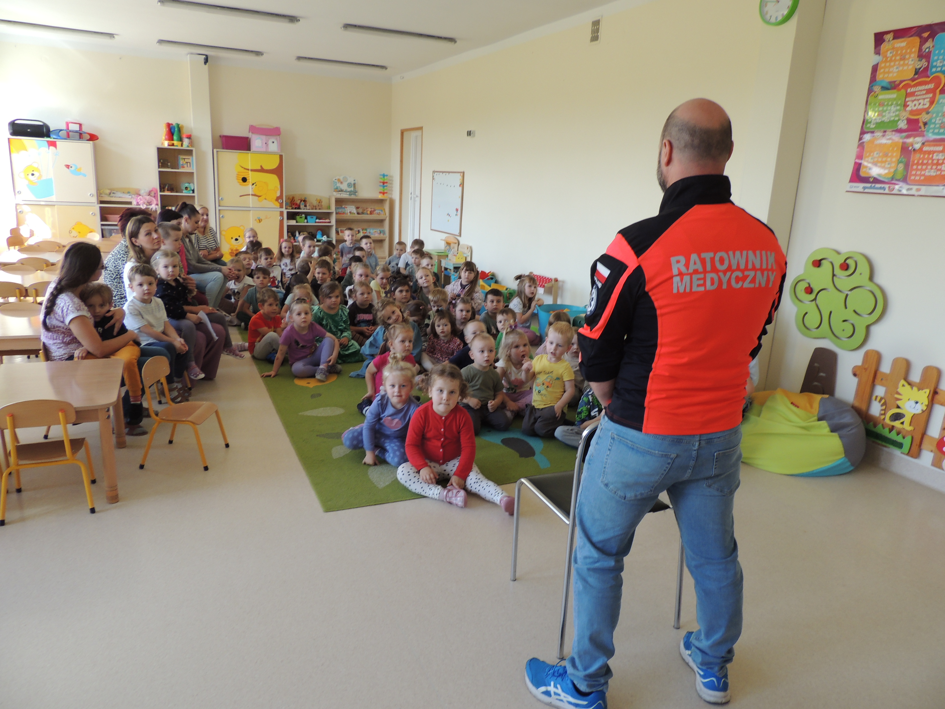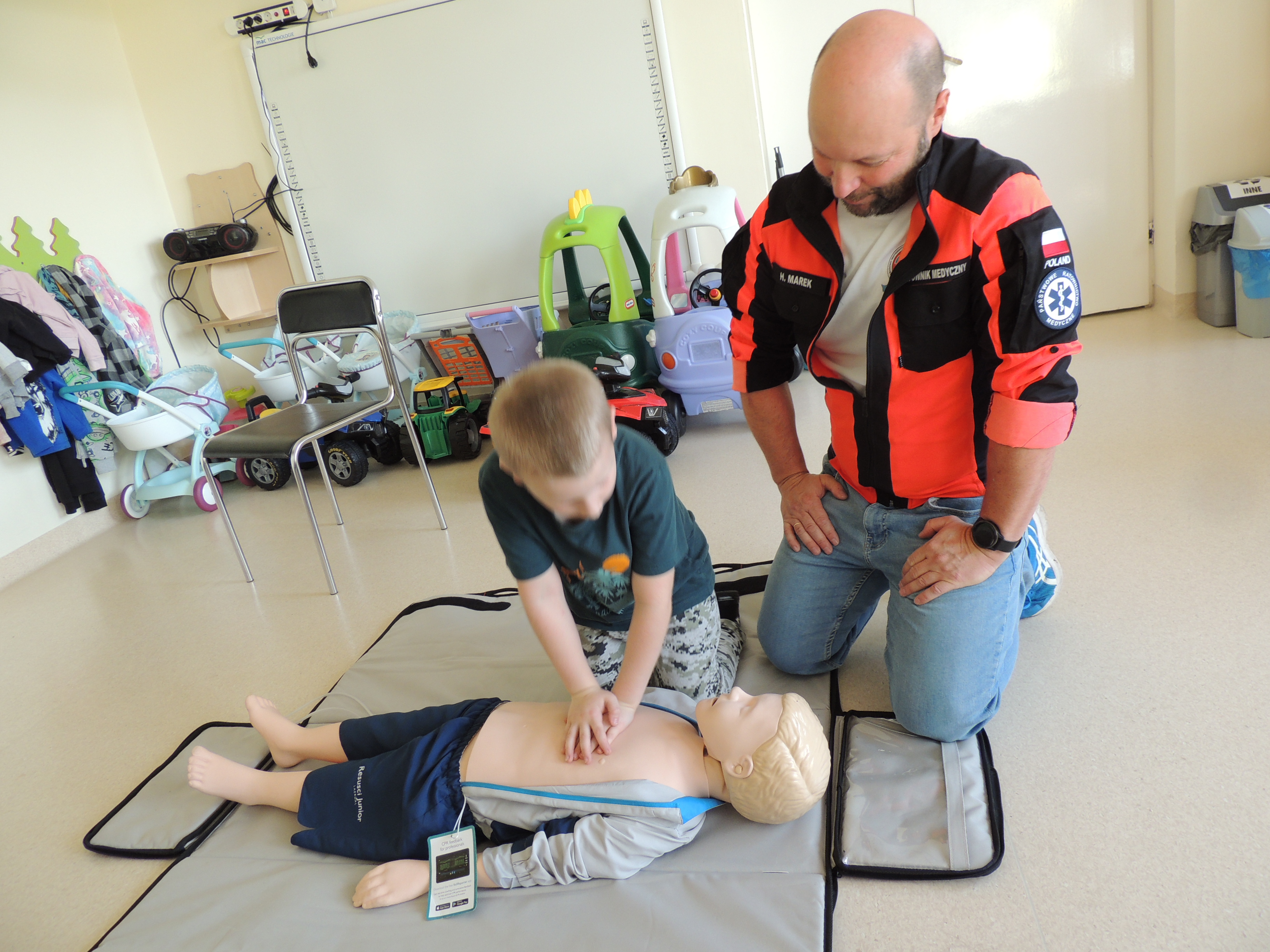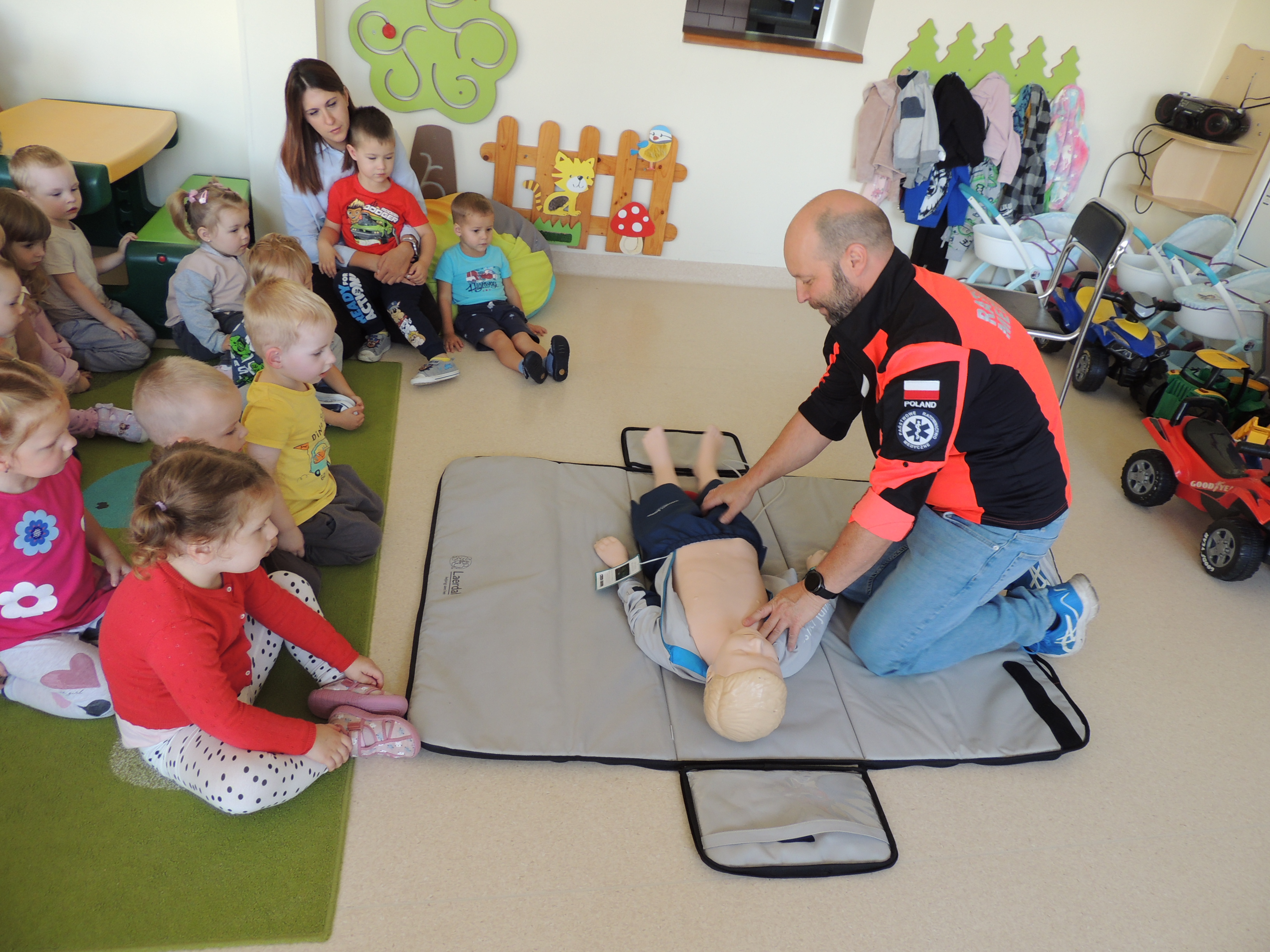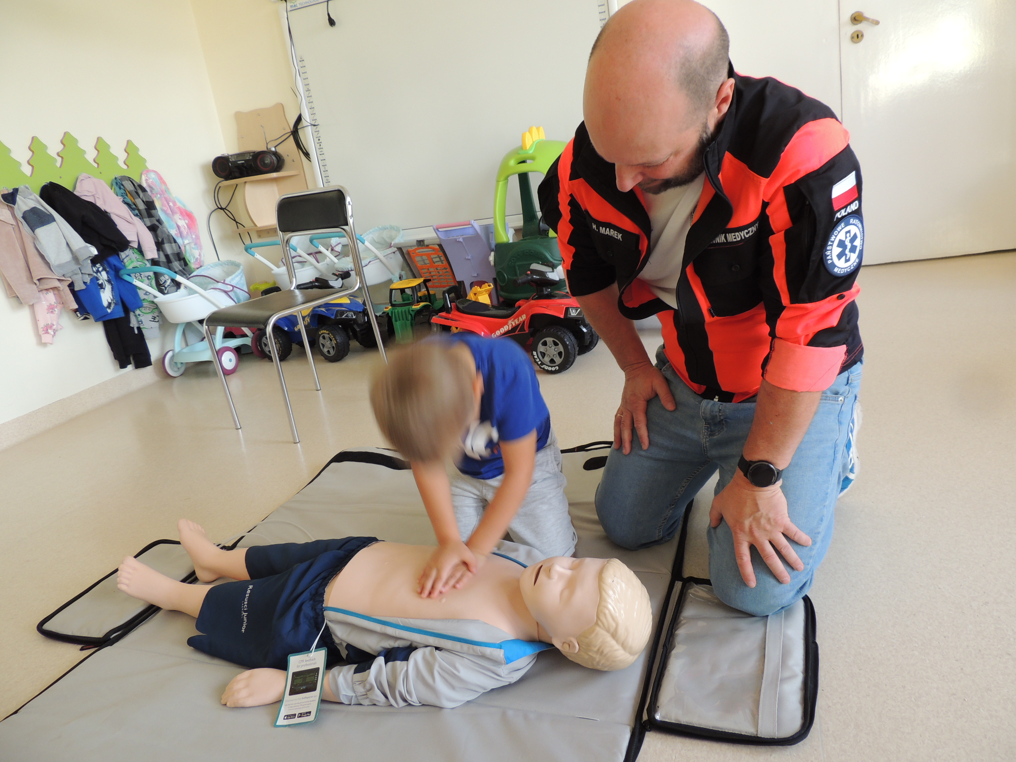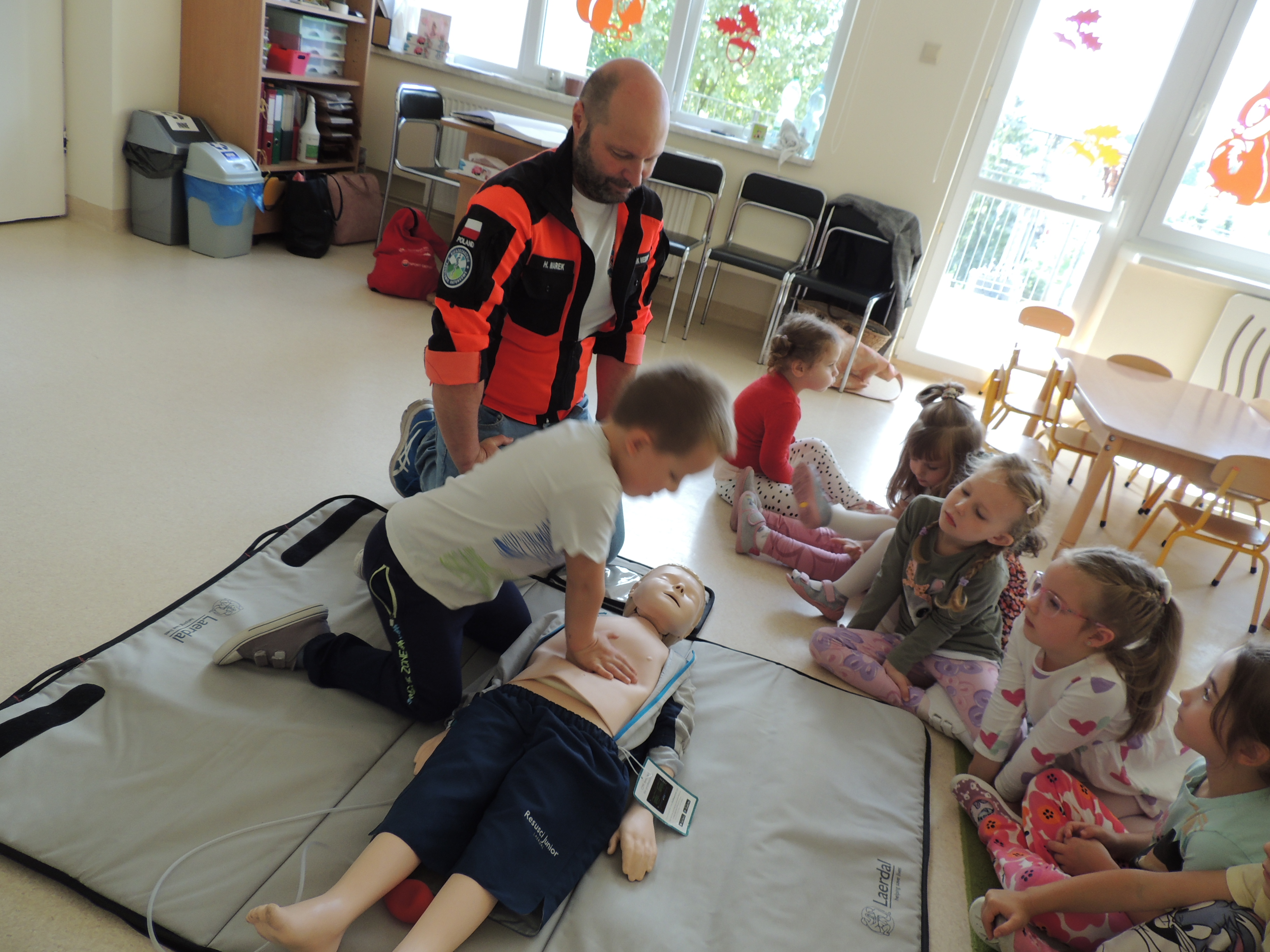 W naszym Przedszkolu dbamy o edukację w zakresie bezpieczeństwa. Dlatego zaprosiliśmy Pana Huberta Marka, który jest ratownikiem medycznym i wykładowcą Uczelni Państwowej im. Jana Grodka w Sanoku. Od godzin porannych szkolenie z pierwszej pomocy odbyła cała Kadra Przedszkola, a następnie edukowały się Przedszkolaki. Celem zajęć przeprowadzonych przez naszego Gościa było przygotowanie Przedszkolaków do wykonywania czynności udzielania pierwszej pomocy. Pan Marek wyjaśnił dzieciom na czym polega jego praca oraz czym zajmują się poszczególne służby ratunkowe. Poza tym dzieci utrwaliły sobie numery alarmowe służb ratowniczych oraz zasady bezpiecznej zabawy. W trakcie prowadzonych zajęć dzieci obserwowały w jaki sposób należy prawidłowo wykonać sztuczne oddychanie i masaż serca.