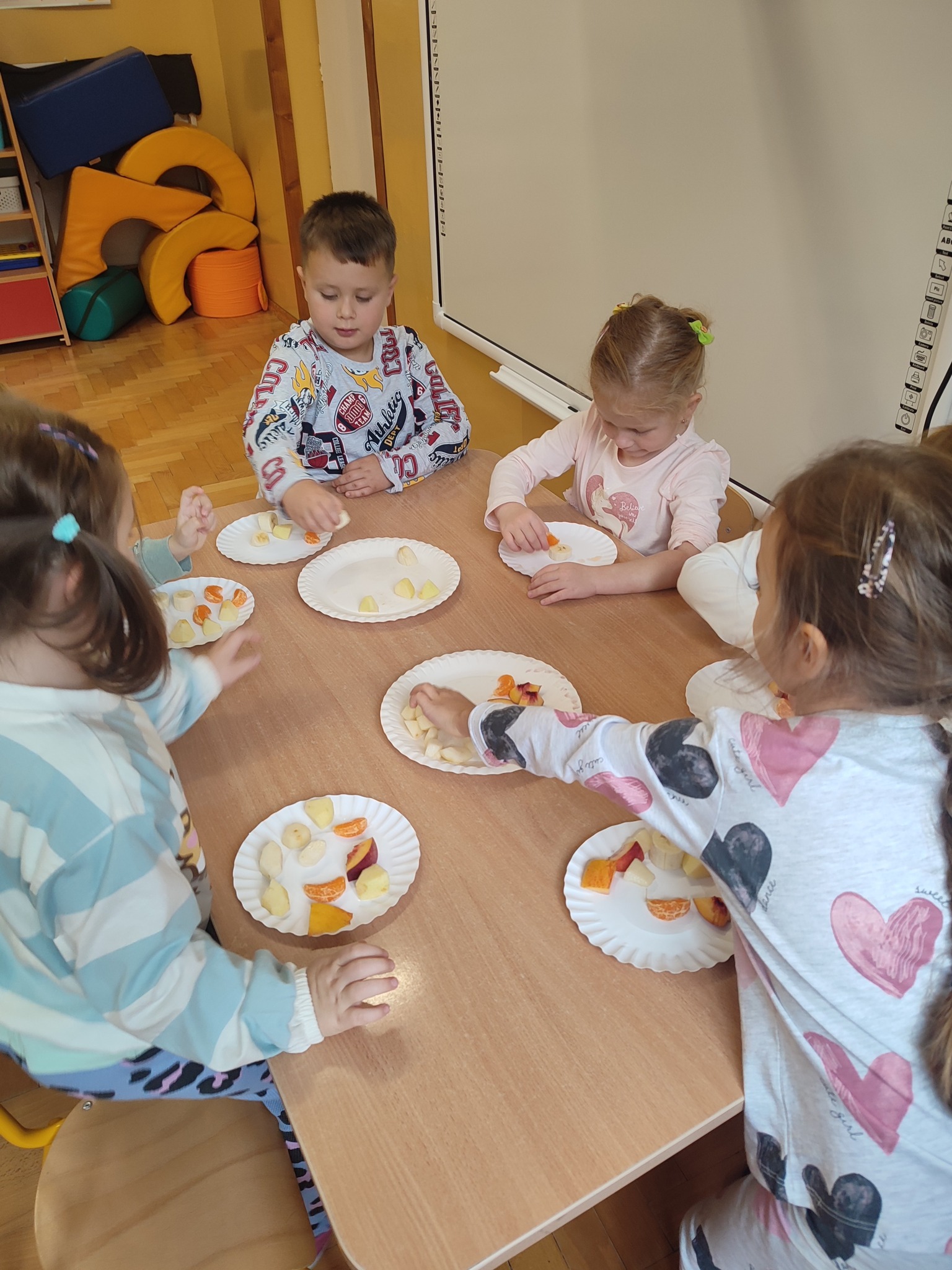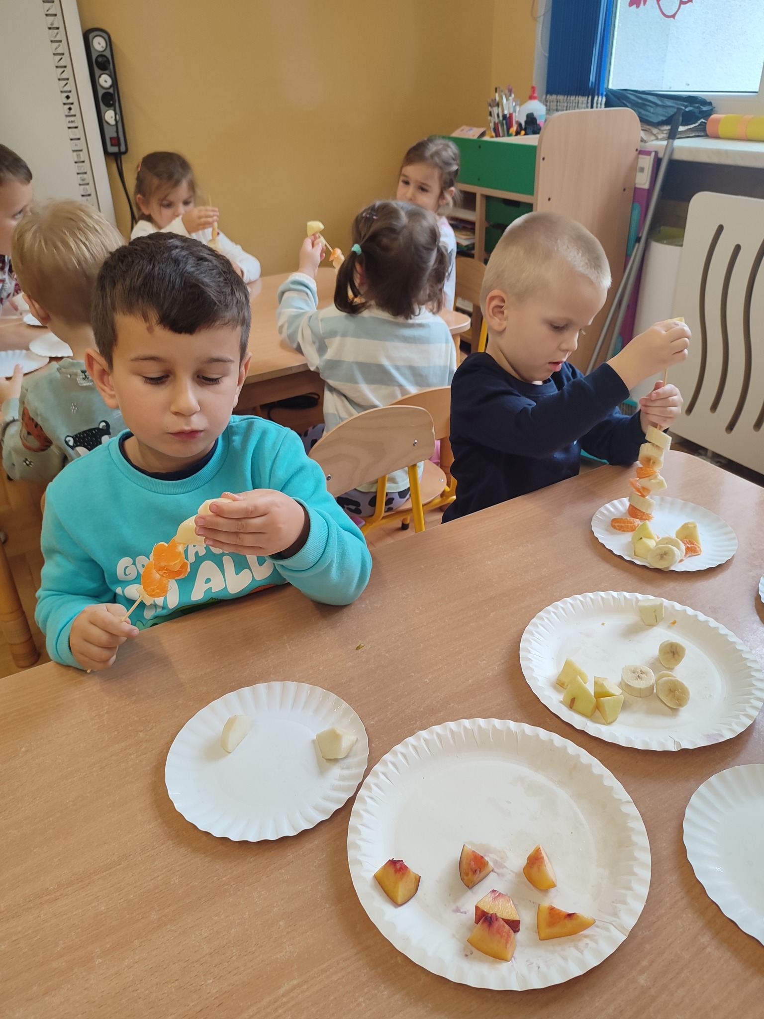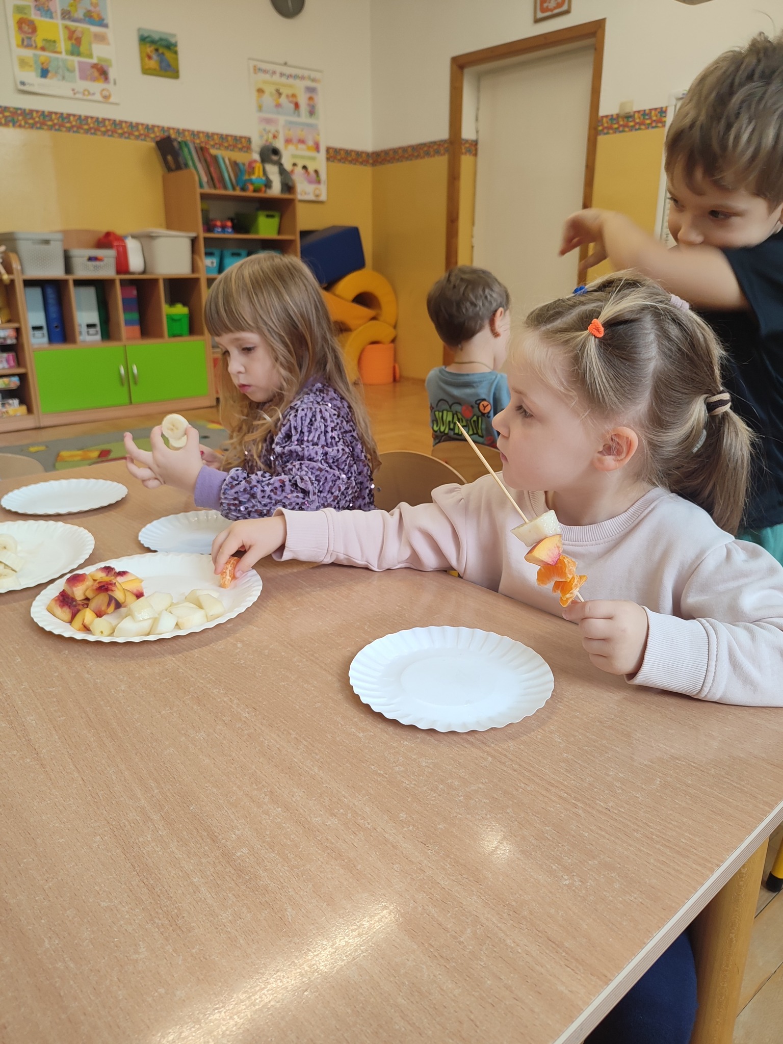 Tydzień owocowy w grupie 4 - latków.Na zakończenie zajęć dzieci samodzielnie przygotowały zdrową i pyszną przekąskę – owocowe szaszłyki. Nabijając kawałki jabłek, gruszek, bananów, brzoskwiń i mandarynek na patyczki, ćwiczyły sprawność manualną. Gotowe szaszłyki zostały z apetytem zjedzone, a dzieci przekonały się, że zdrowe jedzenie może być nie tylko smaczne, ale i kolorowe.