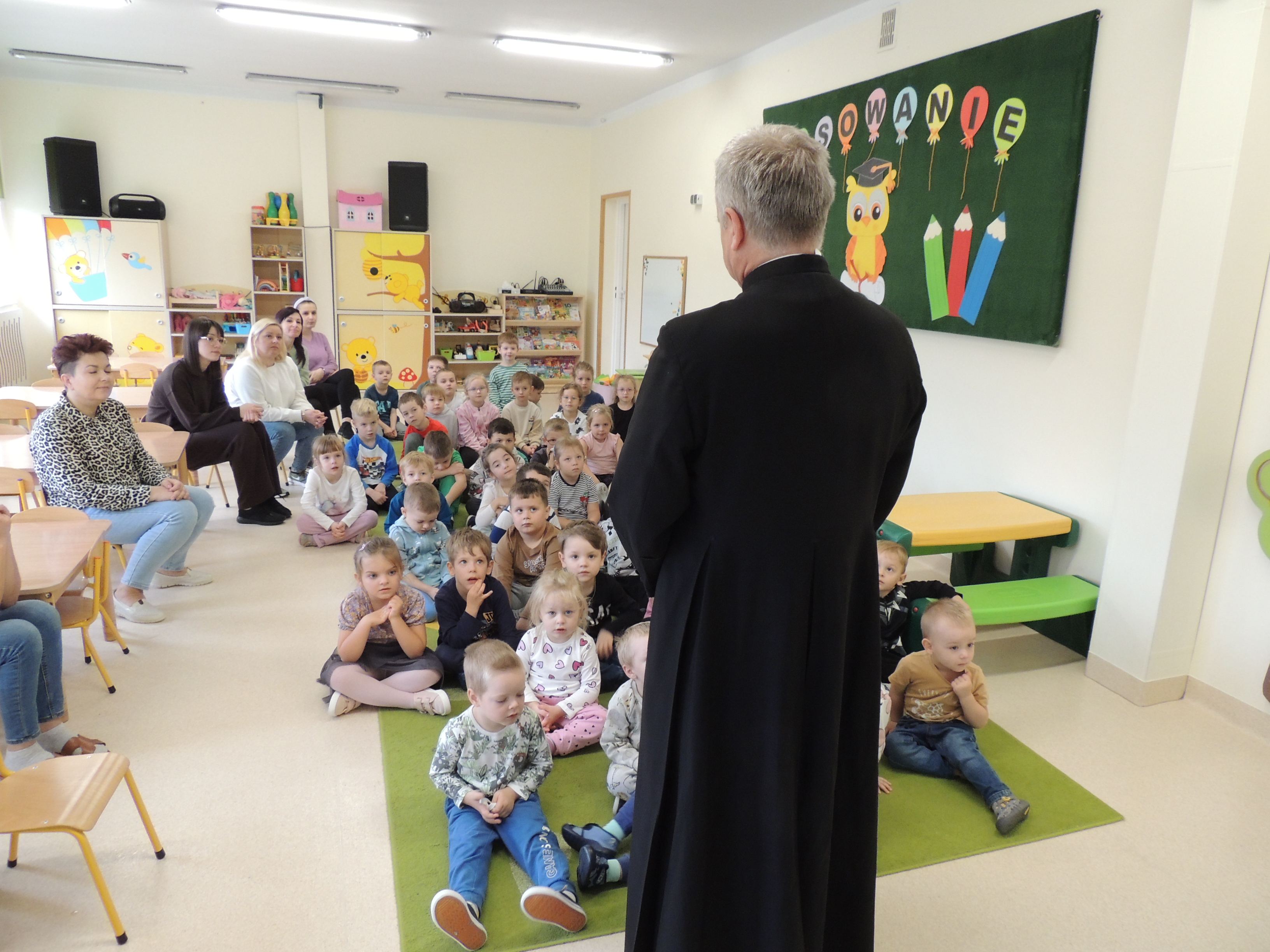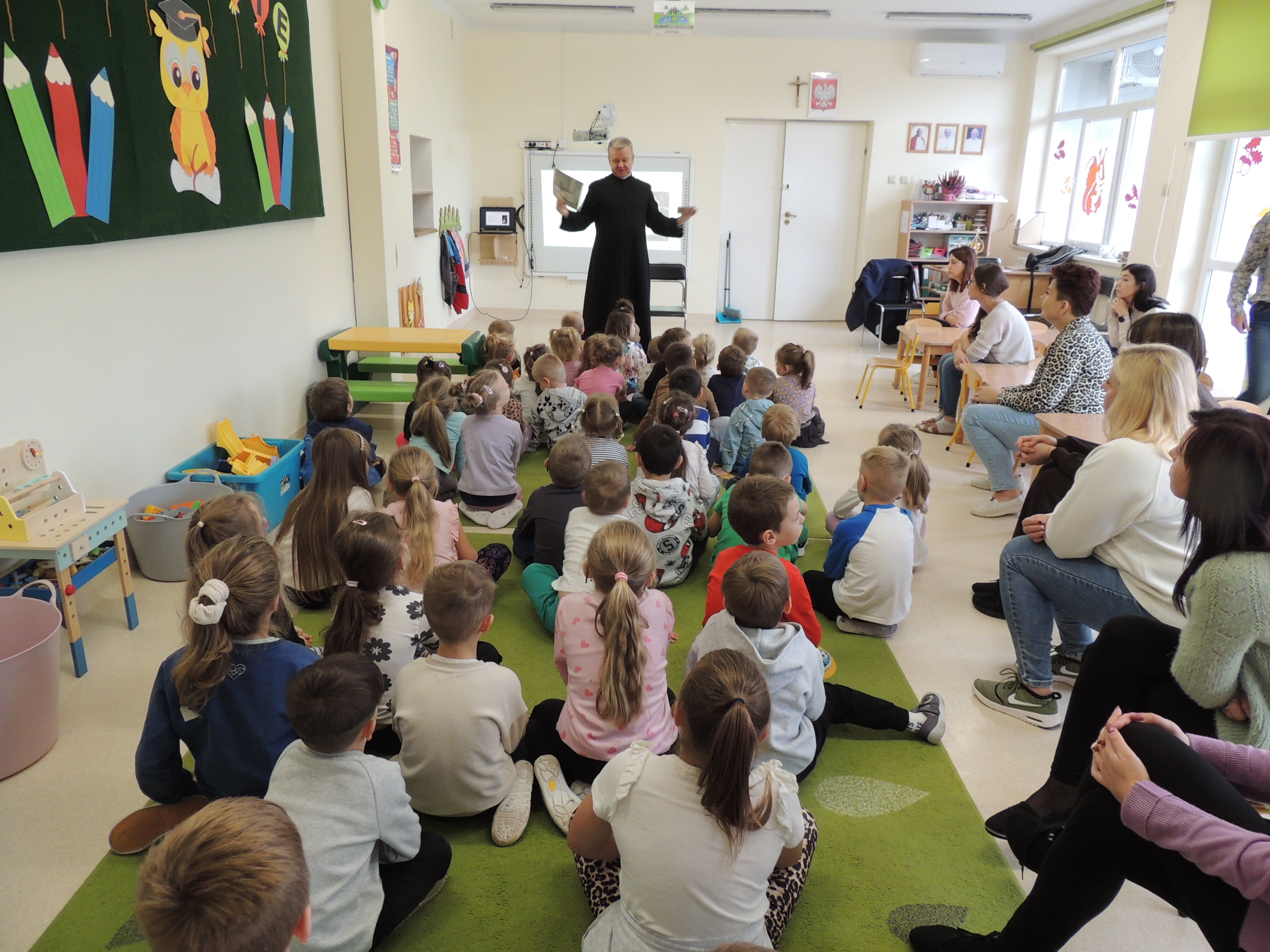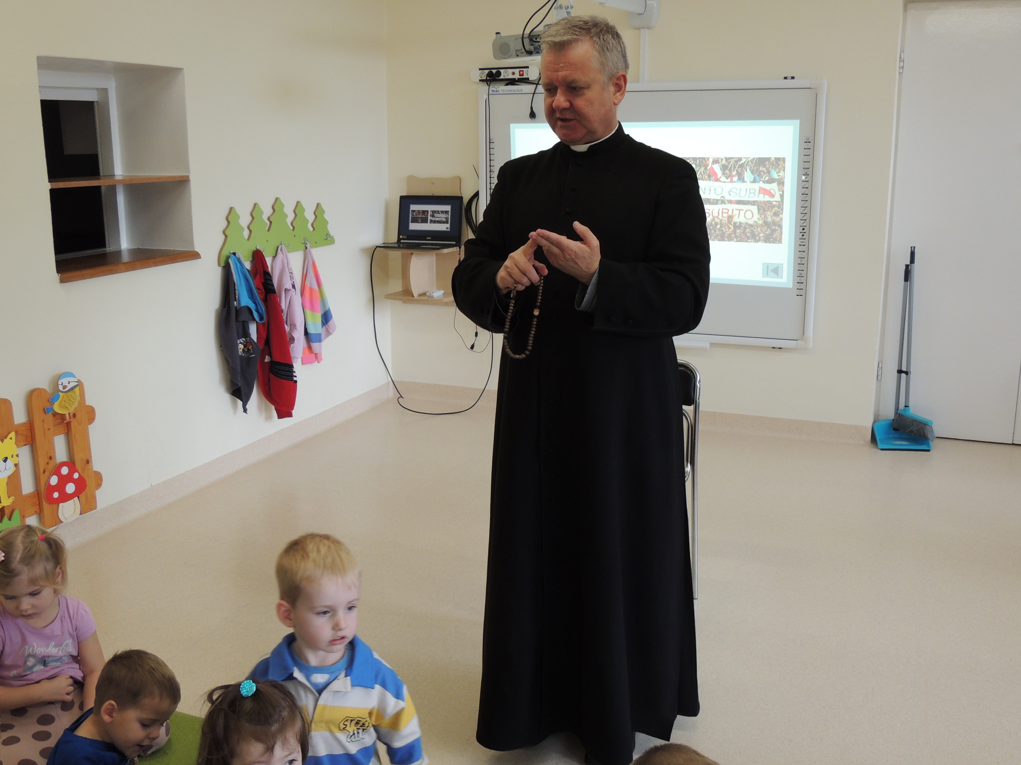 W dniu 15 października, czyli w miesiącu, który jest szczególnie poświęcony modlitwie różańcowej, w naszym przedszkolu odbyło się wyjątkowe spotkanie. Nasze zaproszenie przyjął ks. Proboszcz Stanisław Bąk. Gość przybył, aby przybliżyć dzieciom postać św. Jana Pawła II – Papieża Polaka oraz opowiedzieć o znaczeniu modlitwy różańcowej w życiu każdego chrześcijanina.