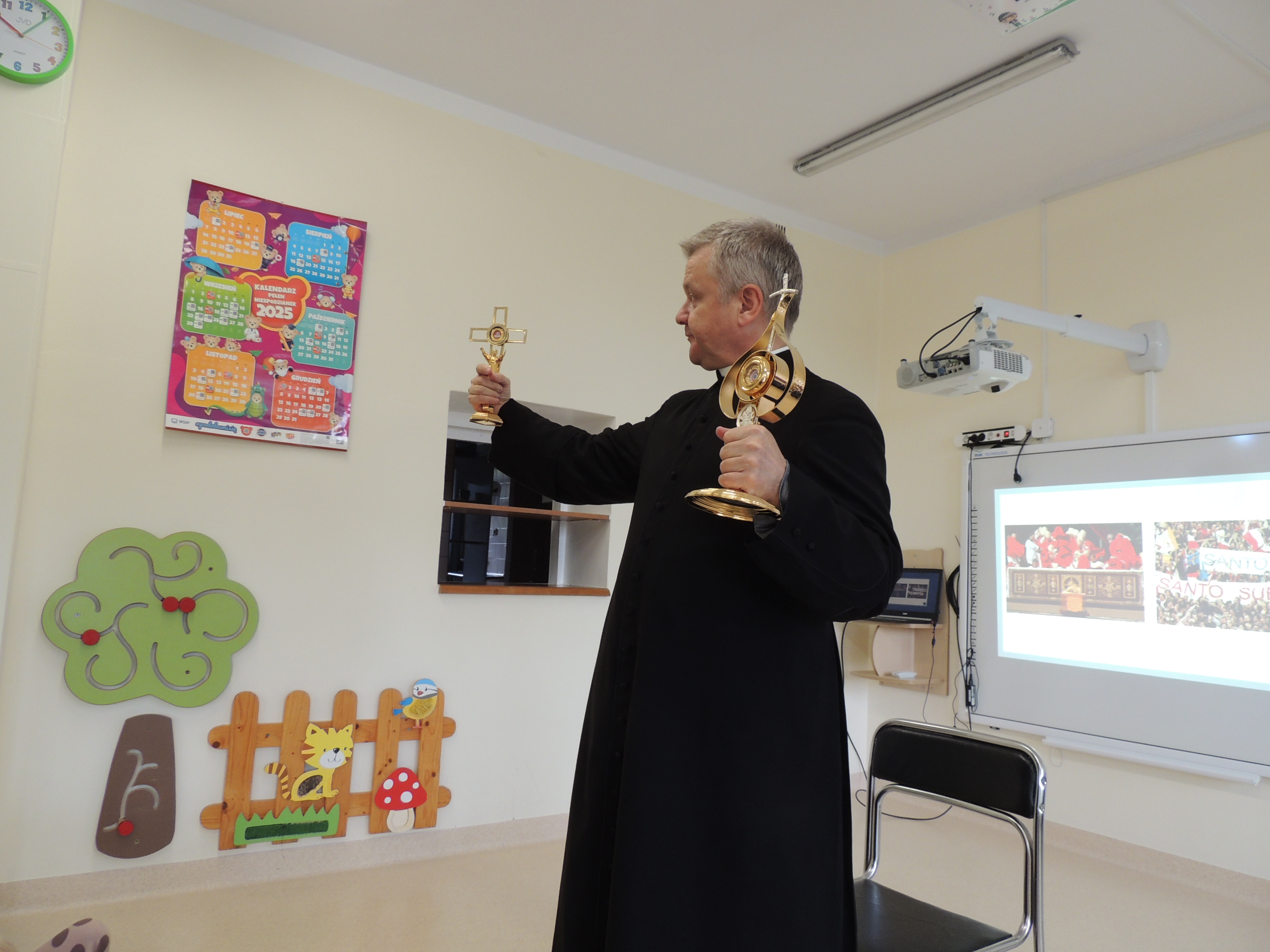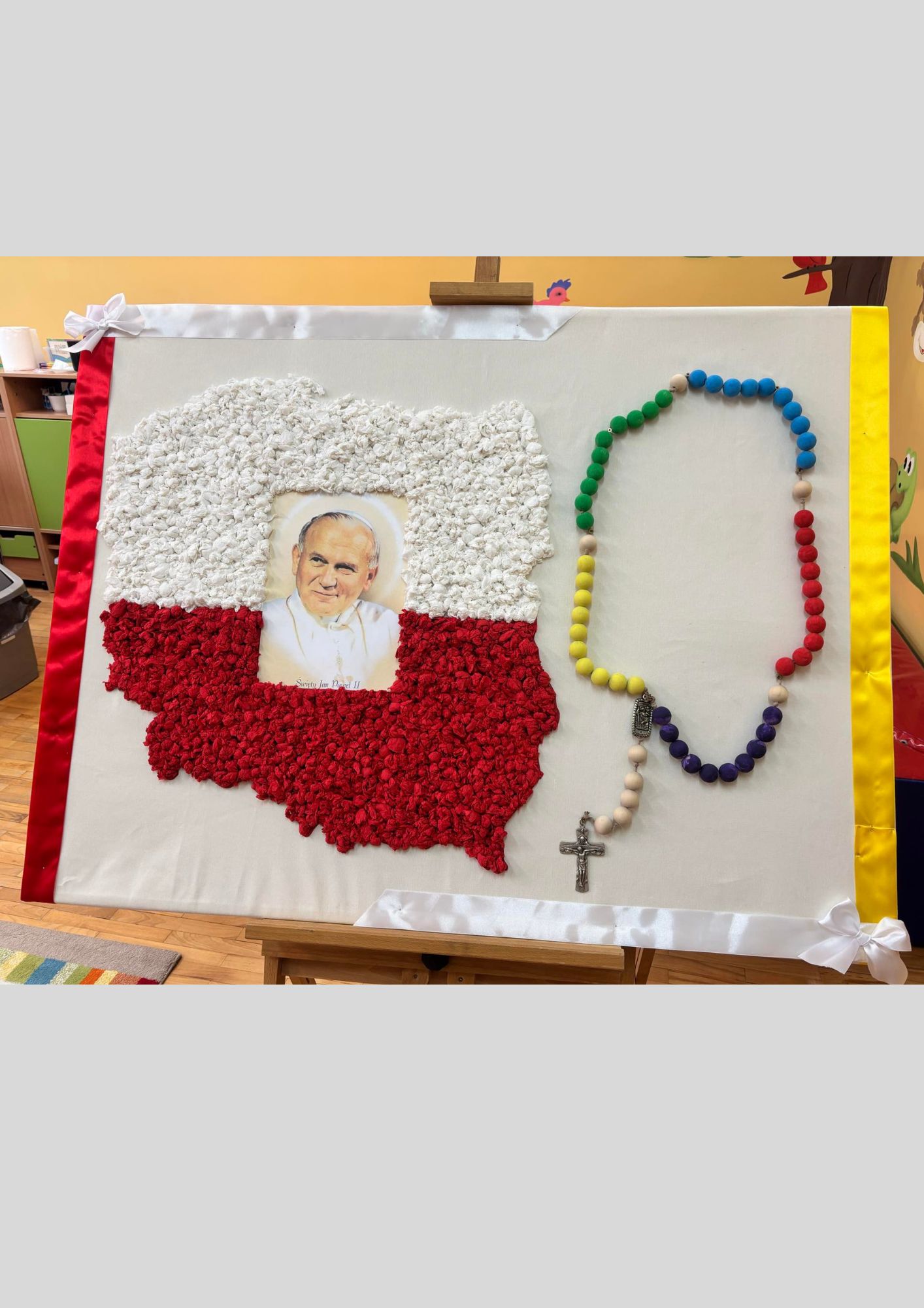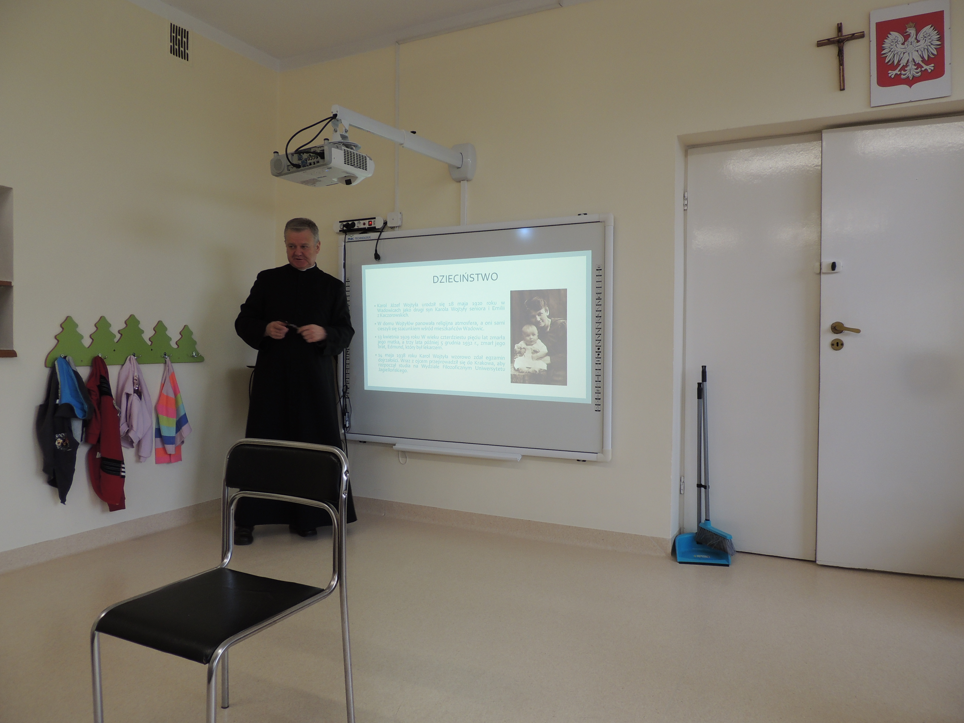 Ksiądz Proboszcz opowiedział o dzieciństwie Karola Wojtyły, jego drodze do kapłaństwa oraz o tym, jak został papieżem. Przedszkolaki z zainteresowaniem słuchały opowieści o miłości Papieża do Boga, ludzi i ojczyzny. Dzieci dowiedziały się również, że Jan Paweł II był człowiekiem radosnym, lubił góry, śpiew i sport.