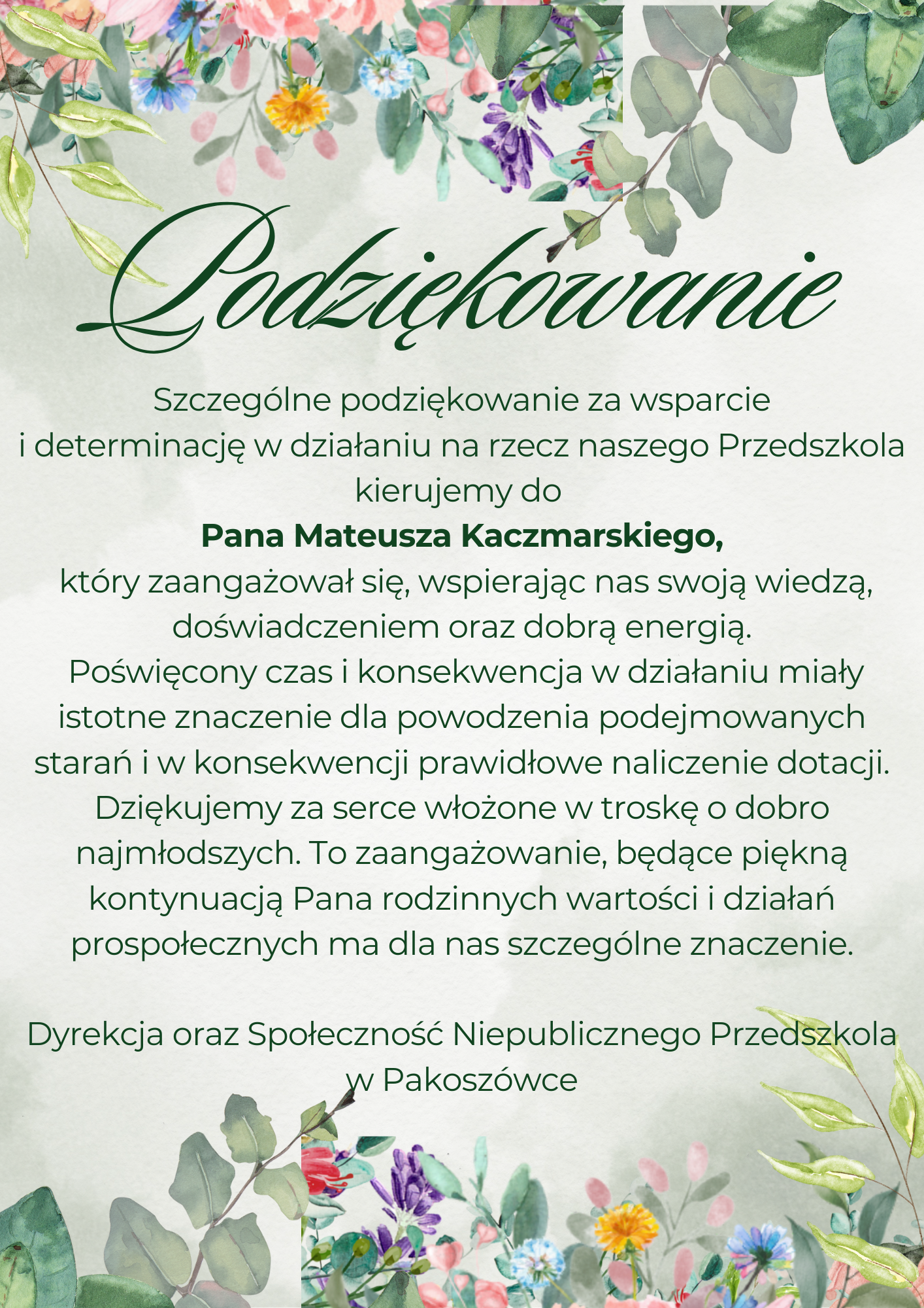 w imieniu całej społeczności przedszkolnej pragnę wyrazić szczere podziękowanie wszystkim, którzy w ostatnim czasie zaangażowali się w działania na rzecz Niepublicznego Przedszkola w Pakoszówce, prowadzące do podniesienia wysokości dotacji. Decyzja o zwiększeniu dofinansowania ma ogromne znaczenie dla naszego Przedszkola oraz dla możliwości tworzenia jak najlepszych warunków edukacyjnych, wychowawczych i opiekuńczych naszych dzieci. Dzięki temu możemy planować dalszy rozwój, inwestować w jakość zajęć, zaplecze dydaktyczne oraz bezpieczeństwo i komfort najmłodszych.